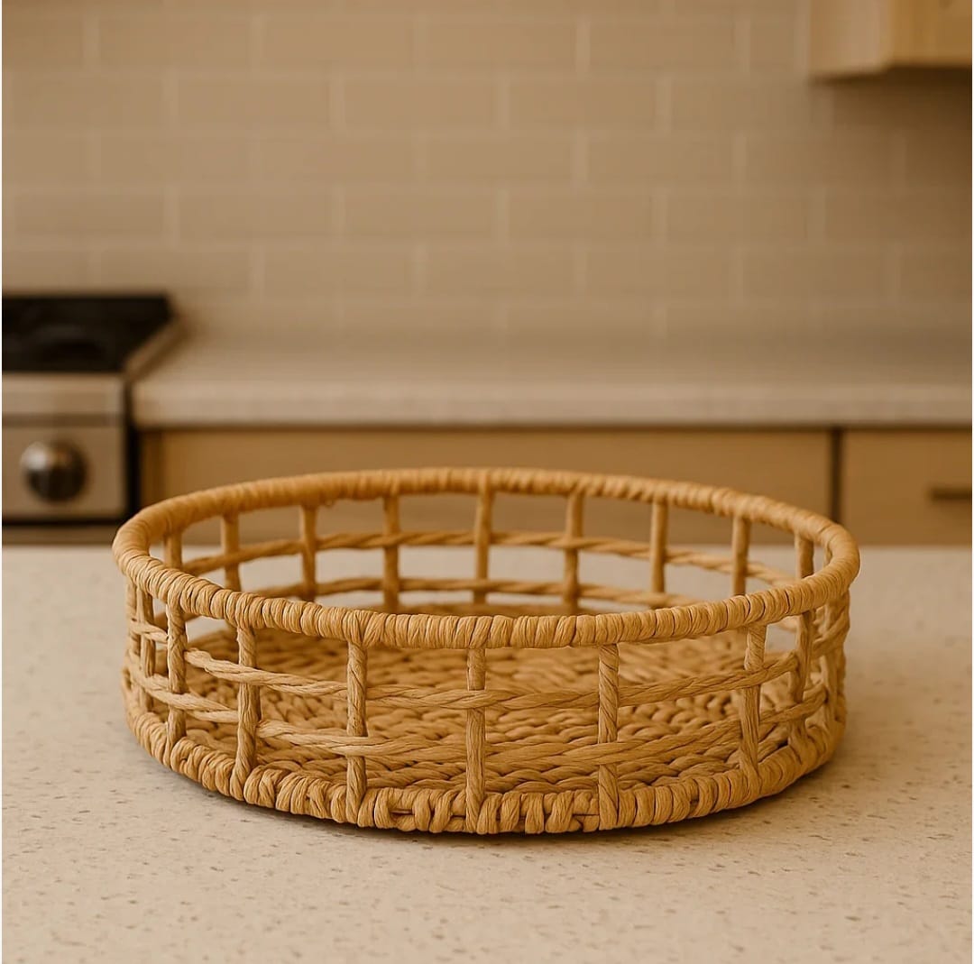 HANDWOVEN METAL FRAMED CIRCULAR BASKET WOVEN WITH RAFIA, FOR HOME DECOR, KITCHEN, LIVING ROOM, BED ROOM, DINING ROOM, BATHROOM, OFFICE